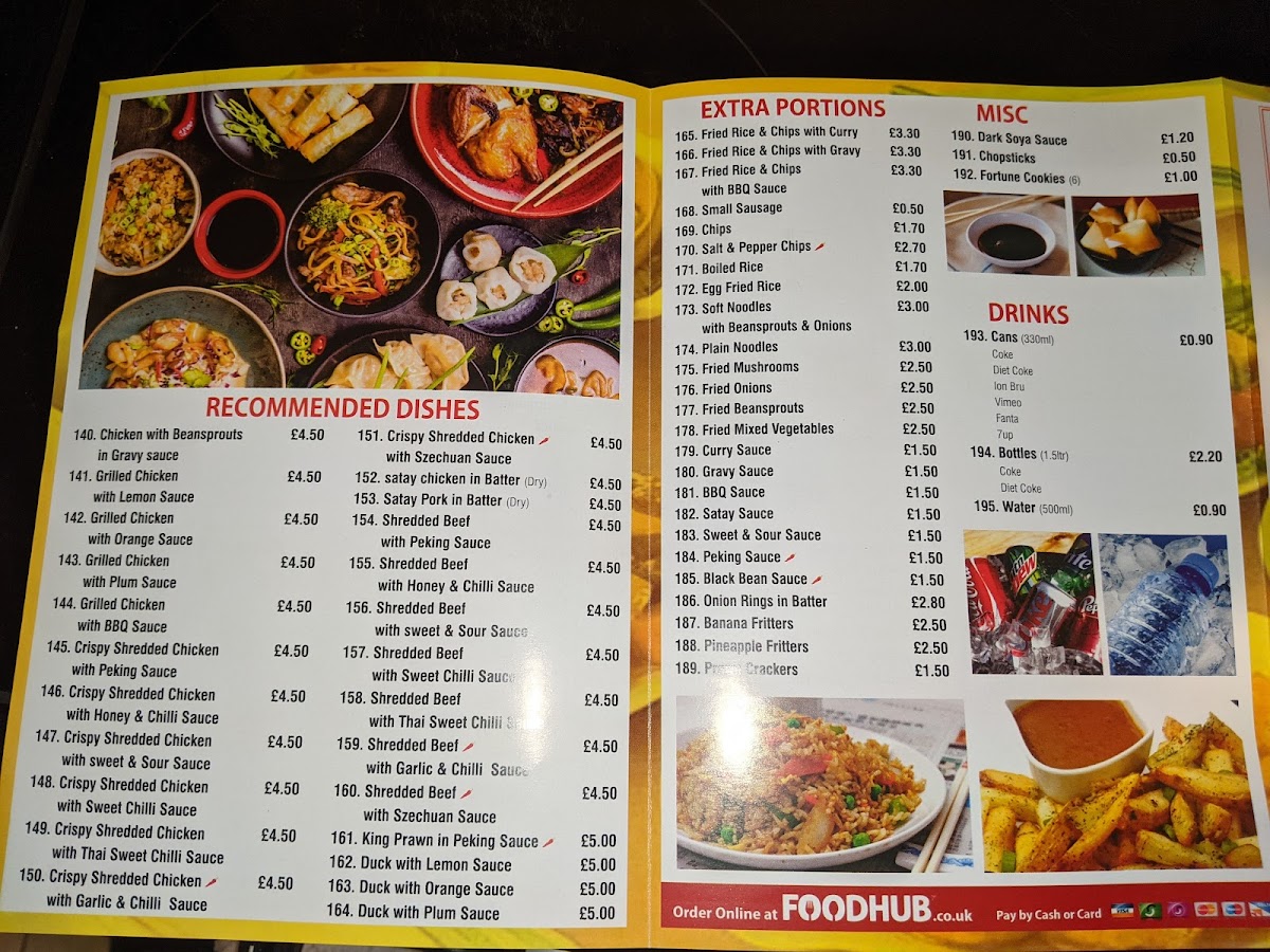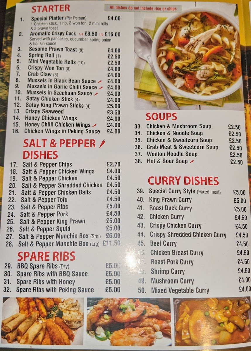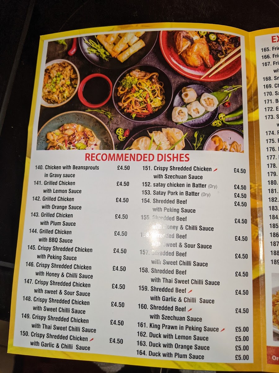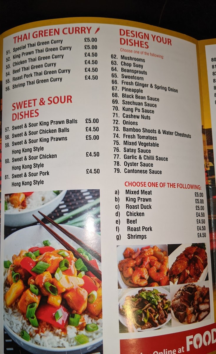 The menu at Lucky Date offers an impressive variety of dishes, catering to various tastes and preferences. For starters, the Special Platter Starter and Quarter Aromatic Crispy Duck Starter are standout choices. The restaurant also offers a selection of Salt & Pepper Dishes, such as Salt & Pepper Chips and Salt & Pepper Chicken Wings. For those craving ribs, options like BBQ Spare Ribs and Spare Ribs With Honey are available. The soup section features comforting options like Chicken And Mushroom Soup and the tangy Hot And Sour Soup. In the curry category, diners can enjoy dishes like the Special Curry and King Prawn Curry, while the Thai Green Curry options, including Special Thai Green Curry and Chicken Thai Green Curry, are perfect for those who enjoy a spicy kick. The Sweet And Sour Dishes include favorites like Sweet And Sour King Prawn Balls and Sweet And Sour Pork Hong Kong Style. For a customizable experience, Design Your Dishes offers choices like Mixed Meat Mushrooms or King Prawn Mushrooms. Vegetarians can opt for Vegetables In Oyster Sauce or Tofu In Black Bean Sauce. The Egg Foo Yung and Omelette Dishes provide savory options such as Special Omelette and King Prawn Foo Yung. For those who love rice and noodles, there are many choices like Special Fried Rice and Special Chow Mein. Additionally, Crispy Thin Noodles and Udon Noodle Dishes are available for those looking for a satisfying noodle dish. The menu also includes Recommended Dishes such as Grilled Chicken With Lemon Sauce and Duck With Lemon Sauce. To round off the meal, patrons can enjoy sides like Fried Rice And Chips With Curry or Chips, and drinks like Coke Can or Irn Bru Can. With set meal options for one, two, or three people, Lucky Date’s menu promises a diverse and delicious dining experience for all.