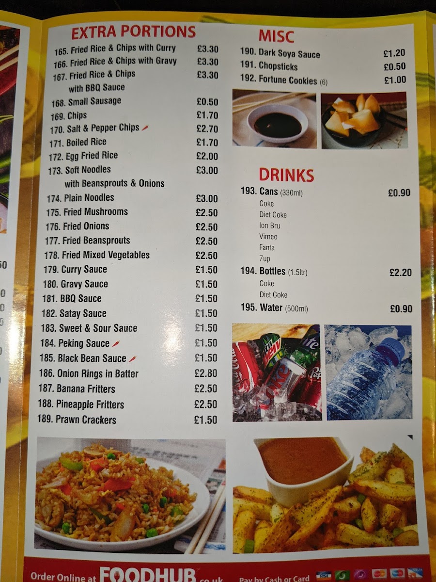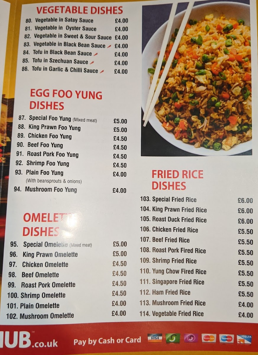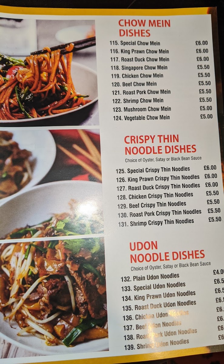 The menu at Lucky Date offers an impressive variety of dishes, catering to various tastes and preferences. For starters, the Special Platter Starter and Quarter Aromatic Crispy Duck Starter are standout choices. The restaurant also offers a selection of Salt & Pepper Dishes, such as Salt & Pepper Chips and Salt & Pepper Chicken Wings. For those craving ribs, options like BBQ Spare Ribs and Spare Ribs With Honey are available. The soup section features comforting options like Chicken And Mushroom Soup and the tangy Hot And Sour Soup. In the curry category, diners can enjoy dishes like the Special Curry and King Prawn Curry, while the Thai Green Curry options, including Special Thai Green Curry and Chicken Thai Green Curry, are perfect for those who enjoy a spicy kick. The Sweet And Sour Dishes include favorites like Sweet And Sour King Prawn Balls and Sweet And Sour Pork Hong Kong Style. For a customizable experience, Design Your Dishes offers choices like Mixed Meat Mushrooms or King Prawn Mushrooms. Vegetarians can opt for Vegetables In Oyster Sauce or Tofu In Black Bean Sauce. The Egg Foo Yung and Omelette Dishes provide savory options such as Special Omelette and King Prawn Foo Yung. For those who love rice and noodles, there are many choices like Special Fried Rice and Special Chow Mein. Additionally, Crispy Thin Noodles and Udon Noodle Dishes are available for those looking for a satisfying noodle dish. The menu also includes Recommended Dishes such as Grilled Chicken With Lemon Sauce and Duck With Lemon Sauce. To round off the meal, patrons can enjoy sides like Fried Rice And Chips With Curry or Chips, and drinks like Coke Can or Irn Bru Can. With set meal options for one, two, or three people, Lucky Date’s menu promises a diverse and delicious dining experience for all.
